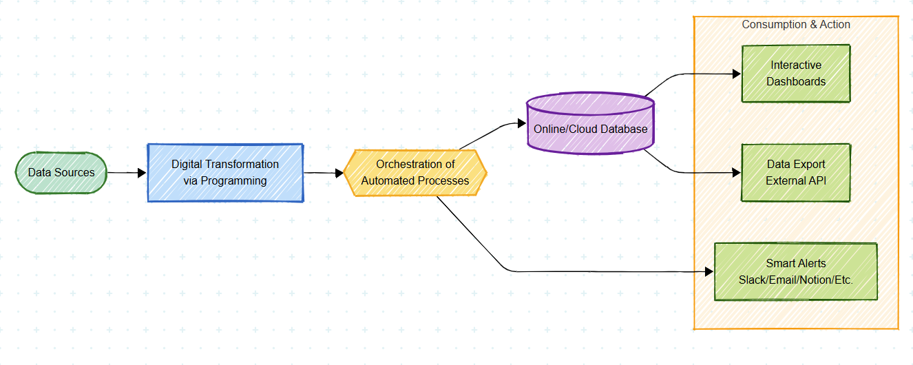 DigitalDataOps is Devsert’s modular data automation framework designed to eliminate manual data consolidation, reporting, and monitoring. With a streamlined, real-time pipeline that connects your data sources to dashboards and alerts, your team can focus on decisions — not data wrangling.